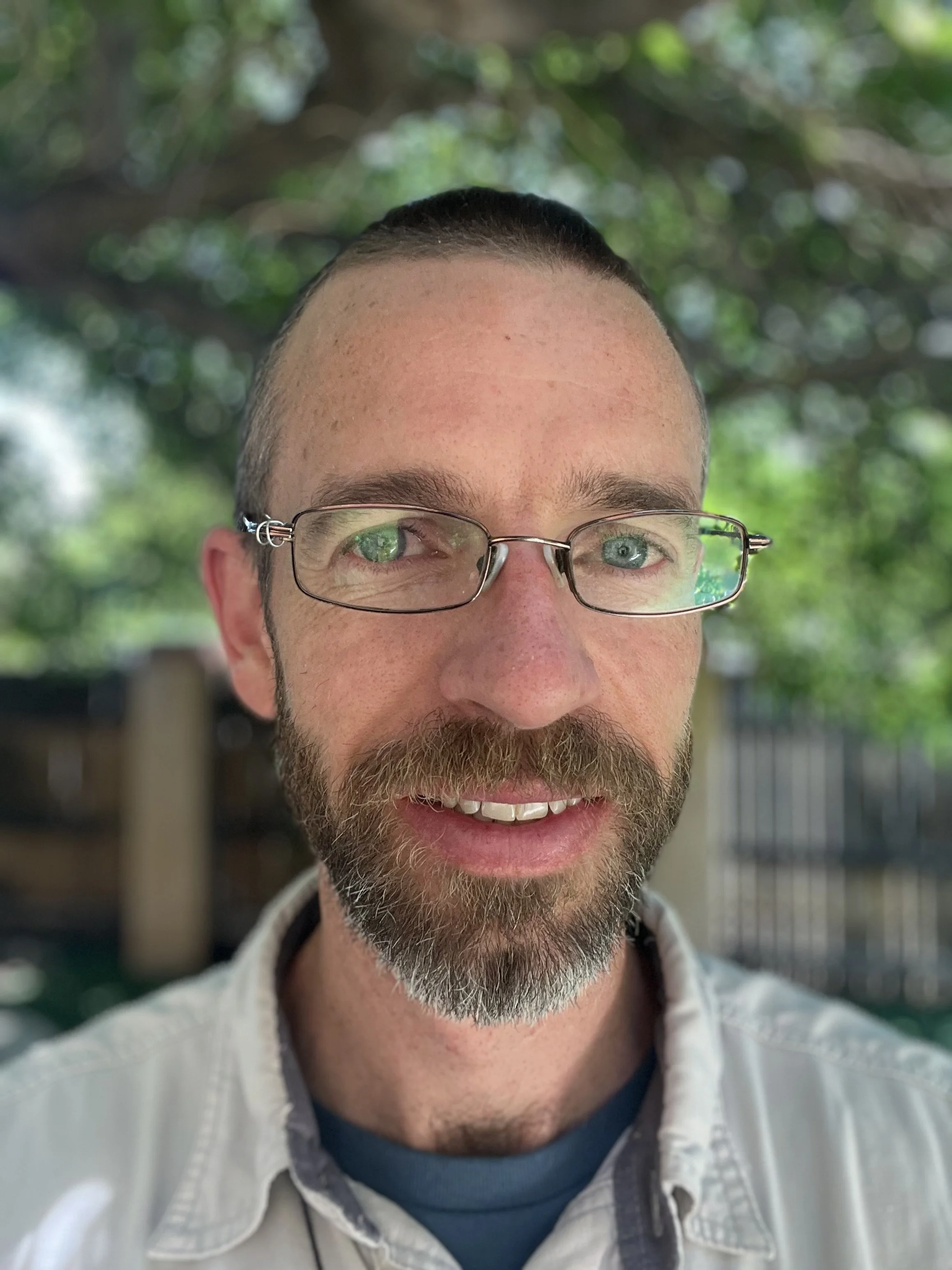 Selfie of Inhora executive director, Miles, with a blurred back yard and trees (and his wire repaired eyeglasses)