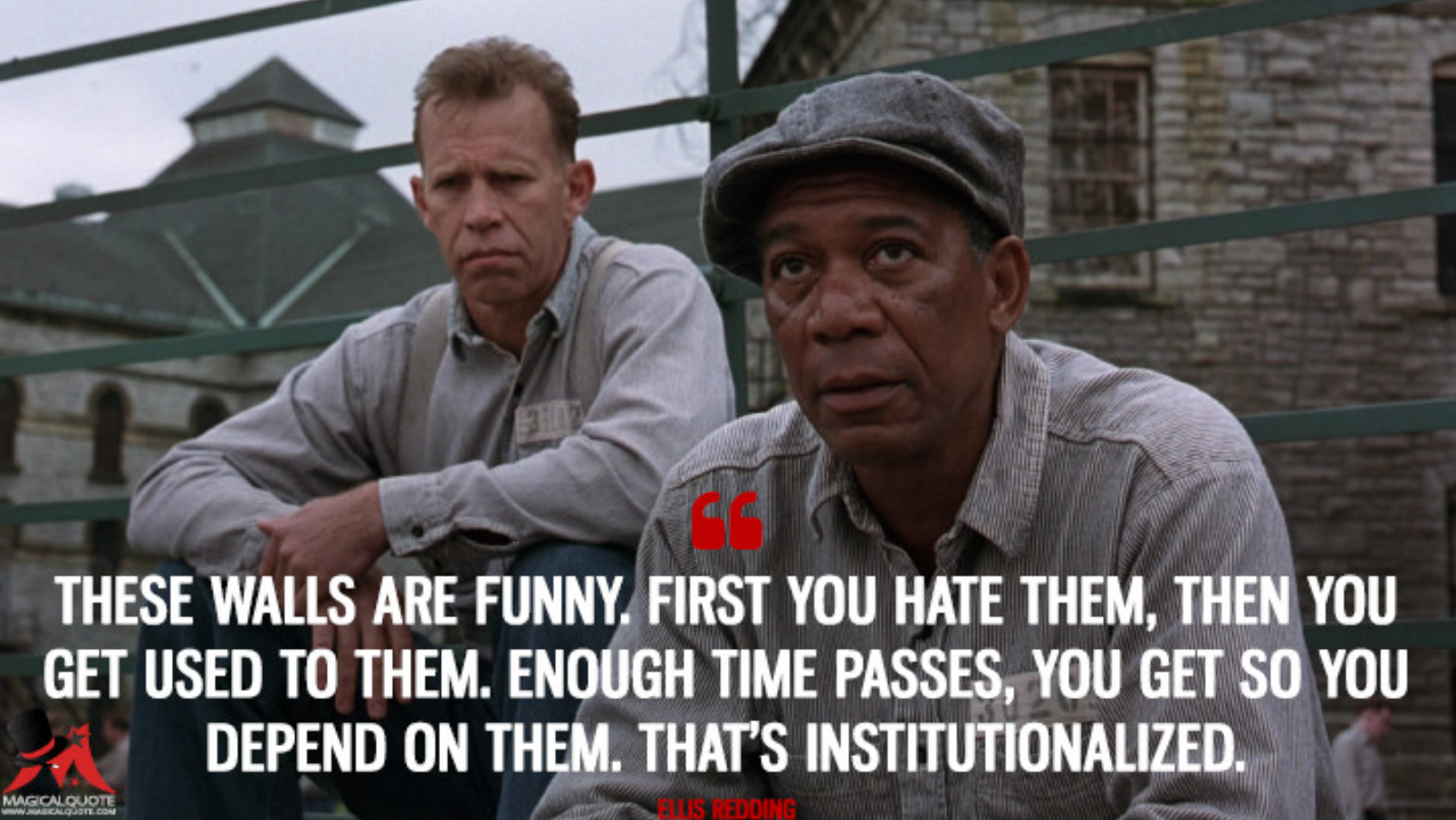 Picture of Red and a fellow prisoner sitting on a bench outside in a prison yard with overlaid words in bold white font, “These walls are funny. First you hate 'em, then you get used to 'em. Enough time passes, you get so you depend on them. That's institutionalized.”