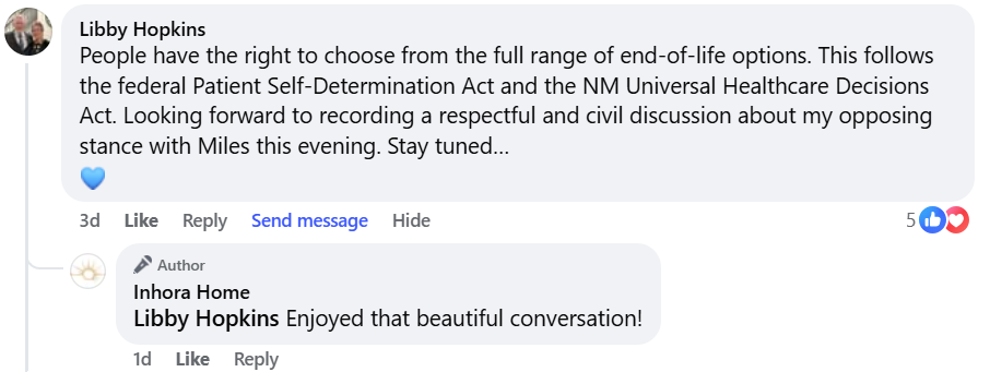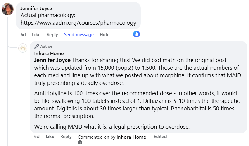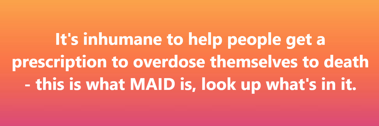 Screenshot of a Facebook post with a orange to pink sunset colors which states: “It's inhumane to help people get a prescription to overdose themselves to death - this is what MAID is, look up what's in it.”